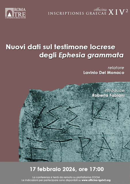 L'incontro sarà moderato da Lavinio Del Monaco (Università di Urbino), che interverrà sul tema “Nuove prospettive sulla testimonianza locrese dell'Efesia Grammata”. Il seminario si terrà nuovamente online sulla piattaforma Zoom.